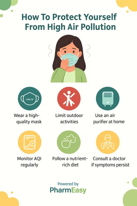 Air pollution in Delhi and the surrounding areas poses a risk to everyone living there. Adopt the precautionary measures outlined above to protect yourself from the harmful effects of pollution. Consult a doctor when needed. People with pre-existing respiratory illnesses (asthma, COPD, pneumonia, etc), pregnant women, and newborns need extra care and protection from pollutants.Â